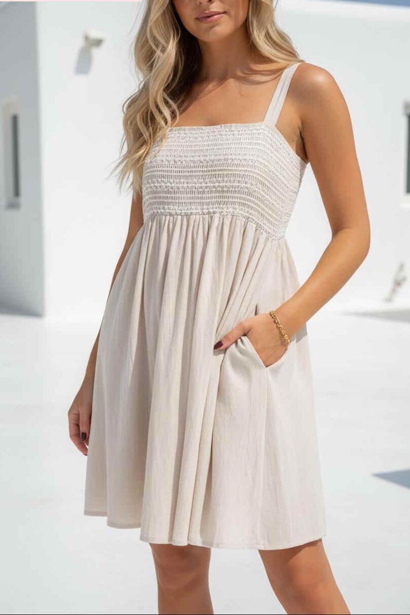 The Willow Mini Dress is a charming Stone coloured piece designed to make you feel effortlessly put-together. Featuring a flattering shirred bust that gently shapes and supports, this mini dress offers both comfort and style for any occasion. The soft, muted sage tone pairs beautifully with everything in your wardrobe, while the fitted bodice transitions into a relaxed skirt for easy movement. Perfect for casual outings, weekend gatherings, or layering with your favourite jacket. A versatile staple that celebrates your natural beauty.