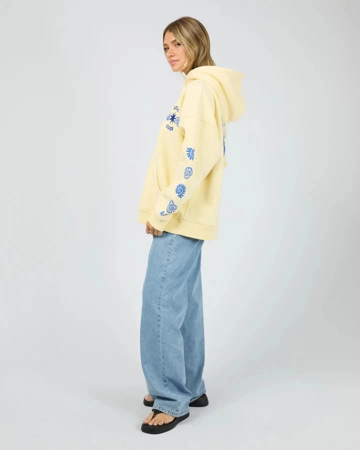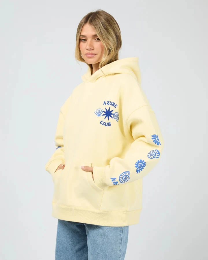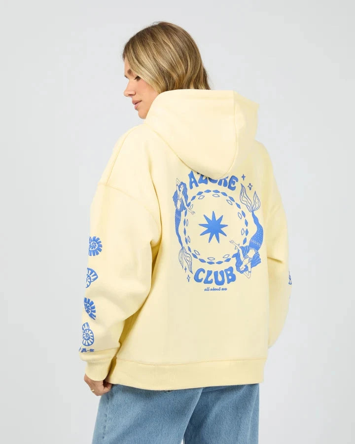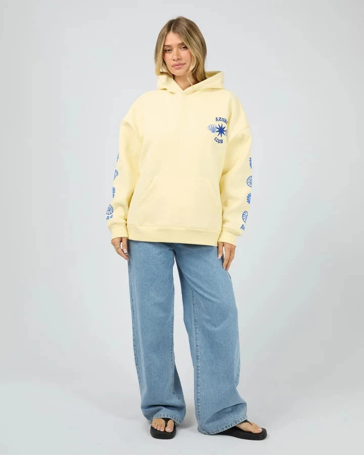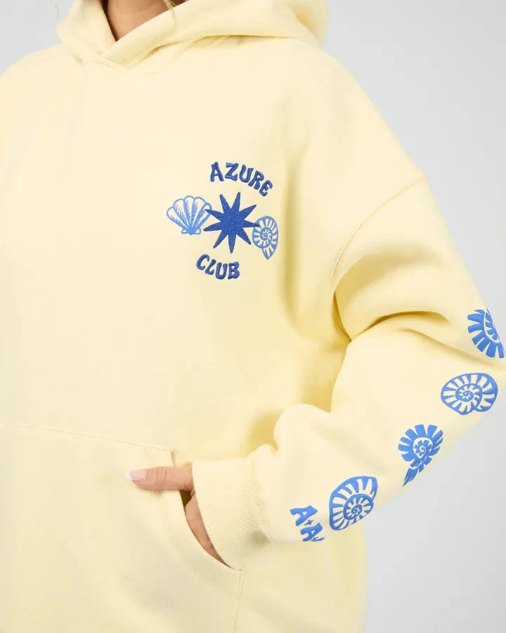 The Azure Club Relaxed Hoodie is designed for easy, everyday wear with a laid-back feel and a playful, coastal-inspired edge. Crafted from a soft cotton-blend fleece, this hoodie feels comfortable against the skin while offering just the right amount of warmth for cooler days. The relaxed fit creates an effortless silhouette that’s perfect for layering, while the hood and front pocket add classic hoodie functionality. Featuring an AAE exclusive graphic across the back, chest, and sleeves, this style brings a fun statement to casual outfits. Finished with a softener wash for a lived-in feel, it’s an easy grab-and-go piece you’ll reach for again and again.