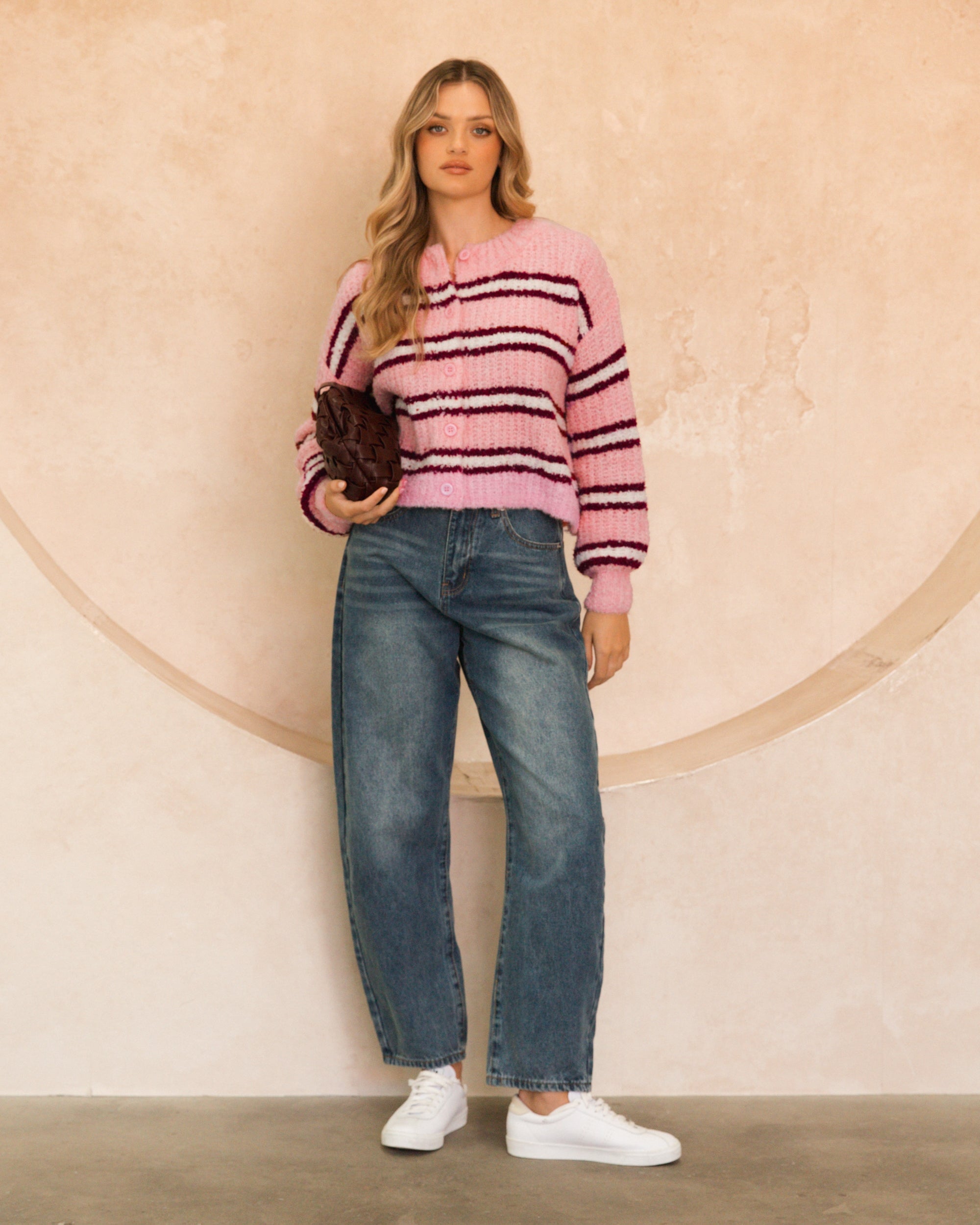 The Rosewood Cardi blends soft pink, crisp white, and rich burgundy for a bold yet feminine colour palette. Whether styled with denim or worn over a dress, this cardigan adds warmth and effortless charm to any outfit.