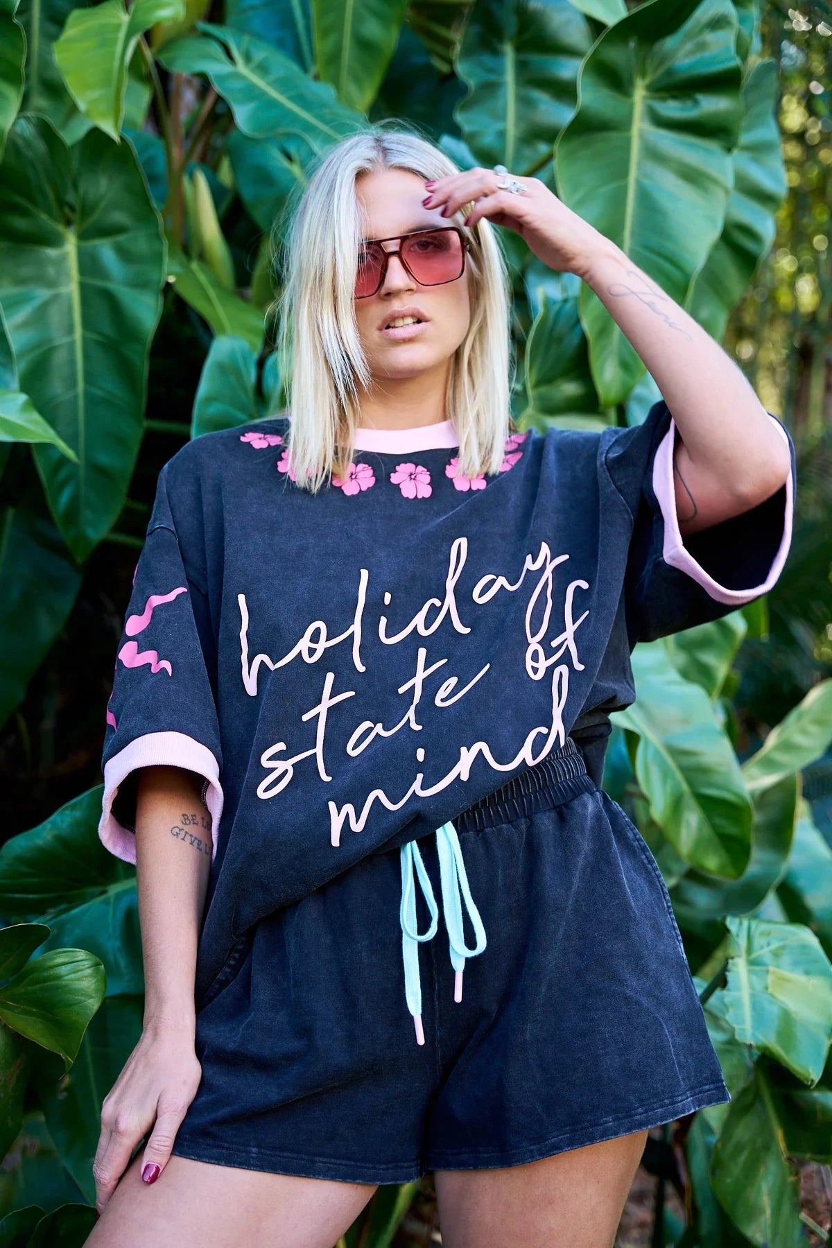 The Hibiscus Hotel Acid Wash Short is a holiday essential — made with a luxurious cotton fabric with a custom printed drawstring. Perfect paired in a set with the Late Checkout Tee. Easy, breezy, and built for laid-back days, kick back and clock out.