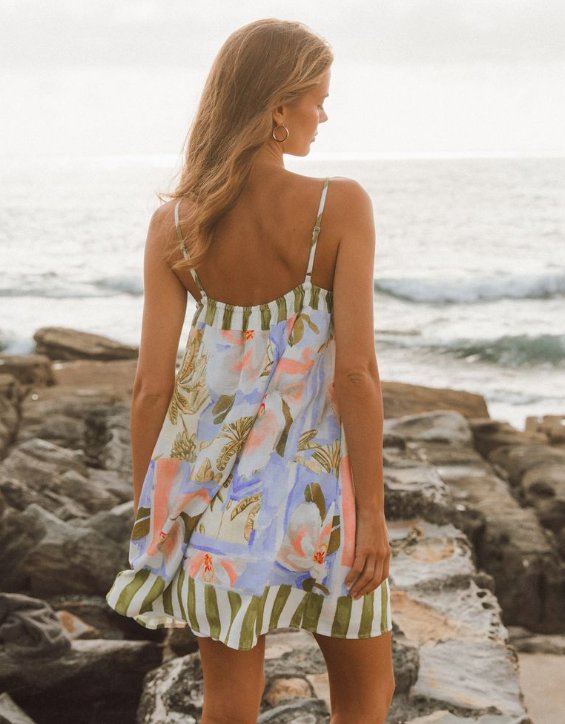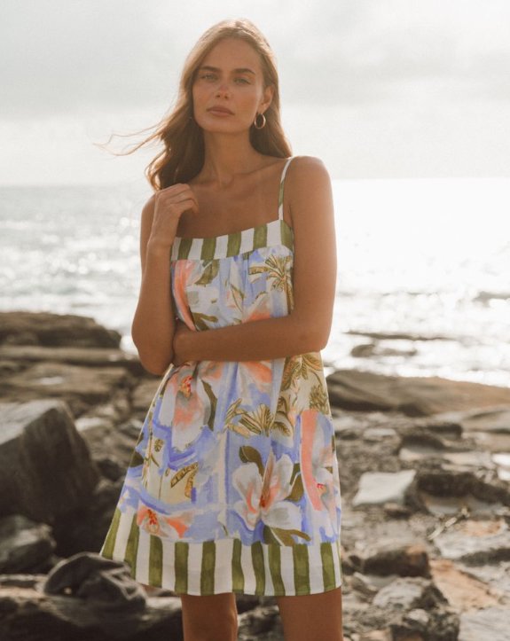 The Delphine Swing Dress brings effortless charm to your wardrobe with its cheerful floral print and distinctive green striped edging. This mini dress features a flattering swing silhouette that moves beautifully with you, making it perfect for casual outings, garden parties, or weekend adventures. The vibrant botanical design pairs wonderfully with the crisp striped trim, creating a playful yet polished look. Whether you're dressing up or keeping it relaxed, this versatile piece celebrates your individual style while keeping you comfortable and confident.